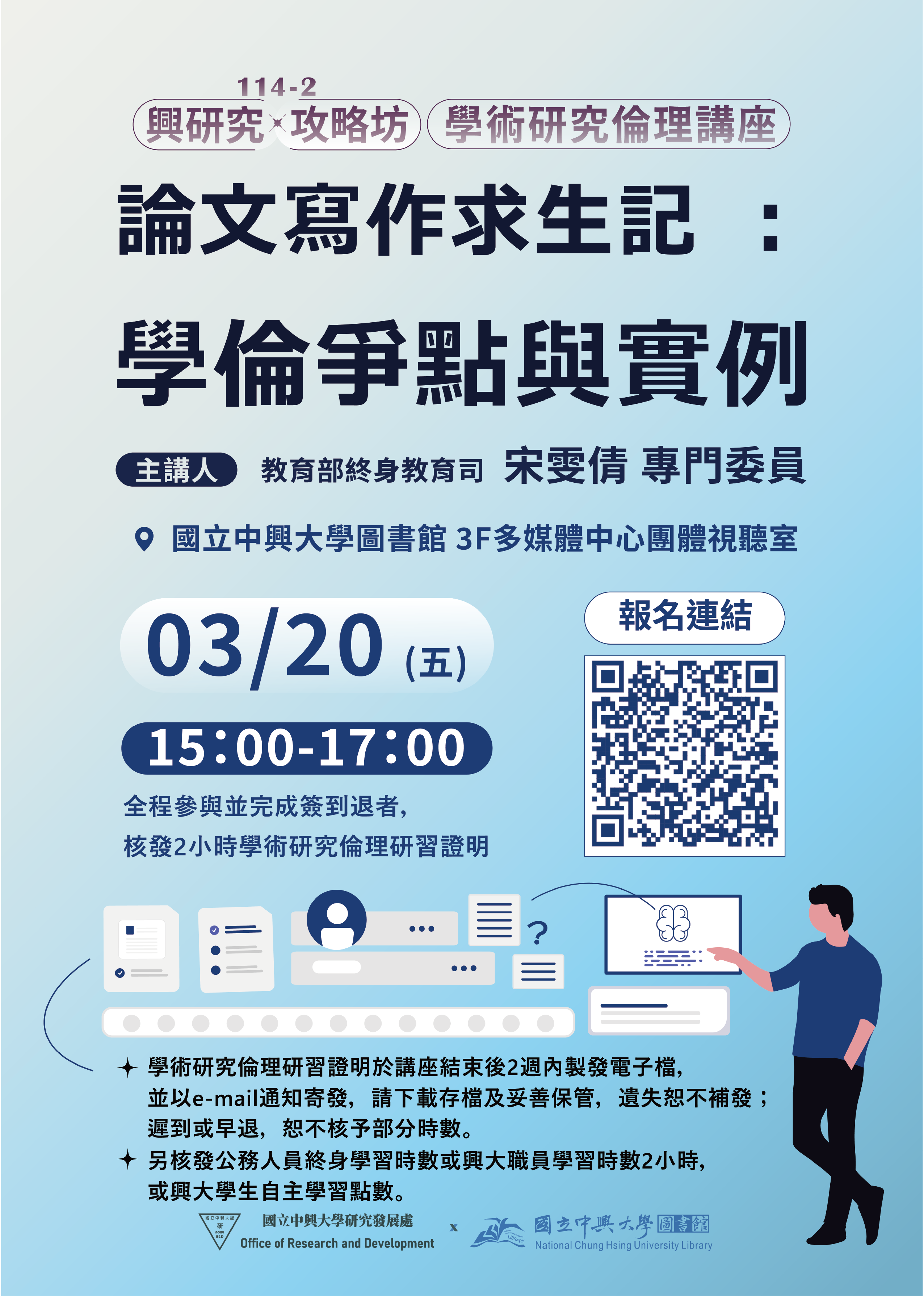 【校外演講訊息】國立中興大學舉辦「學術研究倫理講座」二場次,敬請惠予公告並轉知所屬教職員生踴躍報名參加,請查照。