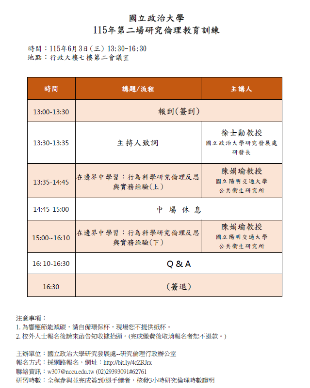 【校外演講訊息】國立政治大學為提升本校教研人員研究倫理知能,本處研究倫理行政辦公室謹訂於115年6月3日舉辦「115年第二場研究倫理教育訓練」,活動訊息詳如說明,敬請轉知所屬教研同仁踴躍報名參加,請查照。
